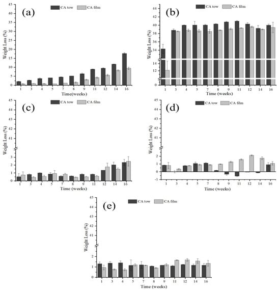 The weight loss rate of CA tow and film in different aqueous conditions are shown in Figure 1. In the HCl environment, with the increase in degradation time, the weight loss rates of both the tow and the film increased slowly, as H+ can promote the reaction of ester bond hydrolysis in CA, in which the weight losses of CA tow increased from 2.07% to 17.71% and the CA film increased from 0.72% to 9.44%. At the same degradation time, the weight loss rate of CA tow was significantly higher than that of the CA film, which could be attributed to the fact that the contact area between CA tow and water phase was larger than that of the CA film leading to a faster hydrolysis rate. When CA was degraded in NaOH solution, the weight loss rate of the tow and film increased rapidly within 1–3 weeks, however, there was no significant change in weight loss rate after 3 weeks, which could be attributed to the fact that OH- would attack the carbon-based carbon atoms in CA and promote the breaking of ester bonds in CA, thus accelerating the degradation []. After the third week, the acetyl groups in CA had been basically removed, and the OH- mainly acted on the ester bond without destroying the glycosidic bond, so the weight loss rate remained unchanged. A similar phenomenon was also observed by Yamashita et al., who found that when CA film with high substitution degree were degraded in low concentration acid-base environment, the sample weight loss decreased faster in alkaline environment than in acidic environment []. Compared with HCl and NaOH environments, the weight losses of CA tow and film in river water, seawater and homemade seawater conditions were significantly lower. When CA was degraded in river water, the weight loss rates of both tow and film increased slowly with the increase of degradation time. As shown in Figure 1c, only 2.34% and 2.48% mass losses of CA tow and film in river water conditions were observed after 16 weeks, respectively, which may be due to the gradual adhesion of microorganisms on the surface of CA and initiating of secretion of specific enzymes to produce degradation sites, thereby removing part of the acetyl group []. During the degradation of CA in seawater and homemade seawater, the weight loss rates of the CA tow and film were rarely altered with the increase in degradation time. Similar result could also be found in the study of Tsuji et al., who studied the degradation of PLLA in static seawater and found that no obvious weight loss was observed in PLLA film after 10 weeks of degradation [].