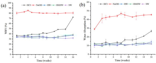 WRV can characterize the wetting degree of cellulose and indirectly characterize the accessibility of cellulose to enzymes []. WRV is the amount of water retained by the substrate after centrifugation, so this method can be used to estimate the total amount of water interacting with a given substrate and as a predictor of hydrolysis yield [,]. The WRV of the CA tow degraded in different aqueous environments were shown in Figure 2a. When CA was degraded in the HCl environment, the WRV increased gradually with the increase in degradation time (from 34.02% to 72.48%). When CA was degraded in NaOH environment for one week, the WRV rapidly reached 80.35%, and no significant change was found afterward, which could be due to the fact that the acetyl groups had been completely removed. When CA was degraded in river water, seawater and homemade seawater, the WRV did not change significantly with the increase in degradation time.