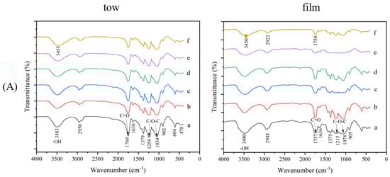 The infrared spectra of tow and film in different degradation conditions are presented in Figure 3. The spectra adsorption peak at 3483 cm−1 and 2950 cm−1 were attributed to the O–H stretching of hydroxyl groups and C-H stretching vibration of methylene [,], respectively. The characteristic absorption peak at 1760 cm−1 was derived from C=O stretching vibration []. The absorption band at 1379 cm−1 was contributed by the C-H stretching vibration of the methyl group, corresponding to the C-H bond in the acetyl group structure []. Absorption at 1254 cm−1 and 1034 cm−1 was assigned to the annular vibration of C-O-C and the skeleton vibration of the C-O-C pyranose ring []. The absorption peak at 902 cm−1 was produced by C-1 fundamental and ring frequency vibrations, indicating that the cellulose units were connected by β-glucoside bonds [].