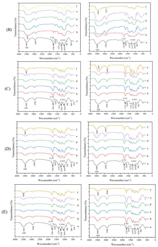 Fourier-transform infrared spectroscopy (FTIR) properties of CA tow and film in different conditions ((A) HCl solution; (B) NaOH solution; (C) river water; (D) seawater; (E) homemade seawater. Interior of each figure: a: original CA; b, c, d, e, f: degradation for 1, 4, 8, 12, 16 weeks, respectively).
