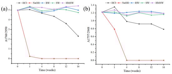 The relative change in the carbonyl group with degradation time could be expressed by the ratio of the absorption peak intensity of 1760 cm−1 to 2950 cm−1 (A1760/2950), and the results are shown in Figure 4. It could also be found that the NaOH condition facilitated the strongest degradation effect on both CA tow and film, followed by hydrochloric acid, river water and seawater; homemade sea water was weak.