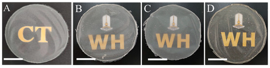 Macroscopic aspect of native CTC film (A) and CTC with 1.38% (B), 2.78% (C), and 4.14% (v/v) (D) glycerol. Note diameter of the plate is 9 cm and scale bars are 3 cm.