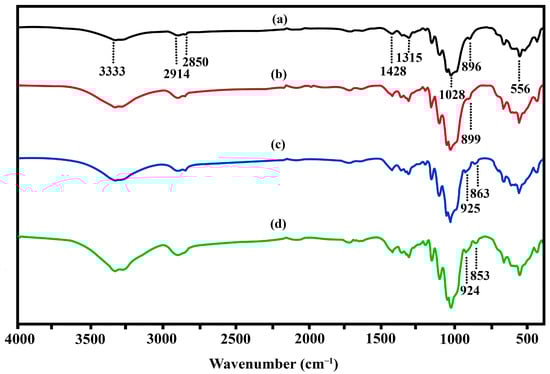 The functional groups and molecular interactions between the constituents in the produced films were examined using ATR-FTIR spectroscopy. Figure 3 shows the results of the ATR-FTIR analysis that was conducted on the cattail cellulose films. The top spectrum (Figure 3(a)) showed characteristic bands of the functional groups of cellulose for -OH stretching, C=O stretching, C-H stretching, and C-O-C (β-(1-4)-glycosidic bond) at 3333, 1727, 1315, 1028, and 896 cm−1, respectively [18,48,63]. Furthermore, C-H stretching is indicated by the absorption bands at 2914 and 2850 cm−1 [49]. The spectra of the cellulose films plasticized with glycerol (Figure 3(b–d)) have some notable differences from the native cellulose film. The characteristic bands between 800–1150 cm−1 are slightly sharper when increasing the glycerol content. This means that introducing glycerol into the cellulose might cause an interaction between the functional groups of the cellulose and the -OH groups of the added glycerol [60,64,65]. The absorption bands of -OH stretching and C–H stretching were also observed at 3333 cm−1 and 2914 and 2850 cm−1, respectively. These characteristic bands progressively intensified as the glycerol level increased. The remarkable absorption bands at 925 cm−1 were found only in the glycerol-plasticized films. The insertion of glycerol molecules in the film matrix may cause an increase in hydroxyl groups, as indicated by the increases in the -OH stretching signal.