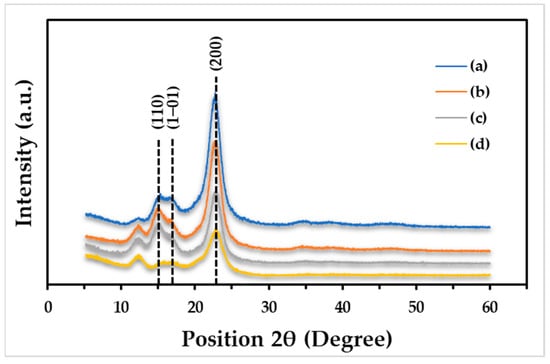 Using X-ray diffraction, the crystallinity of the CTC films with and without glycerol was examined. The XRD pattern of the native CTC film showed diffraction peaks at around 14.5°, 16.5°, and 22.5°, which matched the planes of (110), (1–10), and (200), respectively. These correspond to the crystallographic planes of the cellulose I pattern, as shown in Figure 6(a) [68]. The addition of glycerol significantly reduced the intensity of the diffraction peak at 22.5°, while the peak at 12.3° became more prominent. The presence of glycerol also affected the 14.5° peak: the intensity increased when glycerol was added at 1.38% (Figure 6(b)) and 2.78% (Figure 6(c)) but dropped considerably at 4.14% of glycerol (Figure 6(d)). Overall, the CTC films’ crystallinity declined as the glycerol content rose. As determined from Equation (1), the crystallinity values of the CTC films were 84.65%, 84.15%, 82.12%, and 74.52% for the CTC films with 0%, 1.38%, 2.78%, and 4.14% glycerol, respectively. This indicated that glycerol interfered with cellulose polymeric chain packing and resulted in less-ordered molecular organization. However, the crystallinity of cattail cellulose extracted by this work was in line with the crystallinity of cellulose nanocrystals in previously reports [69].