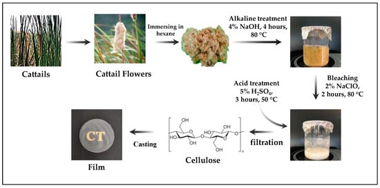 The cattail blossoms were gathered, submerged in ethanol for an hour, cleaned twice with deionized water, and dried for two hours at 80 °C. After the dried sample was weighed, it was boiled for four hours in a ratio of 1:10 in 4% NaOH (w/v). Filtration was then performed to stop the reaction. Distilled water was used to wash the obtained solid until a neutral pH was reached, and 2% (v/v) NaClO was then added for two hours at 80 °C. After centrifuging the reaction mixture to extract the residue, 5% H2SO4 was added and hydrolyzed for three hours at 50 °C. After filtering and neutralizing the pH, the extracted cellulose was stored in a refrigerator in preparation for further processing.