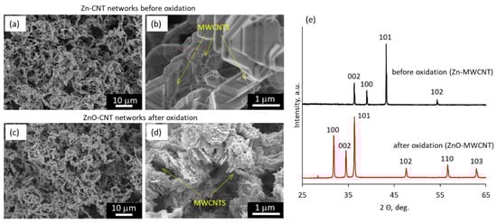 Scanning electron microscope images of (a,b) Zn nanowire networks coated with MWCNT layer (total mass of the deposited MWCNTs 1 mg) and (c,d) the same network after the thermal oxidation process; (e) X-ray diffraction patterns of the Zn–MWCNT network before (black curve) and after (red curve) the thermal oxidation process.