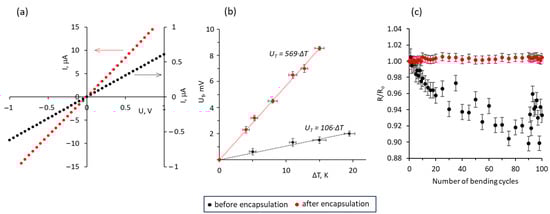 (a) Current–voltage curves of the ZnO–MWCNT hybrid network containing 0.25 wt.% of MWCNTs before (black dots, secondary scale) and after (red dots, primary scale) encapsulation in epoxy adhesive; (b) thermally generated by the ZnO–MWCNT hybrid network voltage vs. temperature difference applied between its sides before (black dots) and after (red dots) encapsulation; (c) ratios of the resistance of the bent sample (R) to its initial resistance (R0) vs. number of bending cycles down to 5 mm radius for ZnO–MWCNT hybrid network with 0.5 wt.% of MWCNTs before (black dots) and after (red dots) encapsulation.