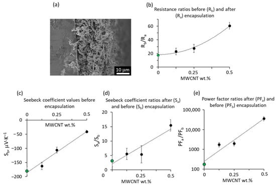 (a) Scanning electron microscope image of a cross-section of a ZnO-CNT hybrid composite; (b–d) relative comparison of resistance of ZnO network (green dots) and ZnO-CNT hybrid nanostructured composites (black dots) before and after encapsulation in epoxy adhesive vs. MWCNT content in the composite; (c) Seebeck coefficient of ZnO–MWCNT hybrid networks before encapsulation in epoxy adhesive vs. MWCNT content; (d,e) relative comparison of the (d) Seebeck coefficient; and (e) power factor of ZnO network (green dots) and ZnO-CNT hybrid nanostructured composites (black dots) before and after encapsulation in epoxy adhesive vs. MWCNT content in the composite.