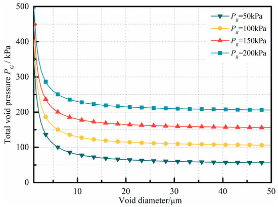 where represents the void diameter. Choosing the resin–void surface tension , correlation curves of the internal void pressure versus the void diameter, with as the controlling parameter, can be plotted, as shown in Figure 1.