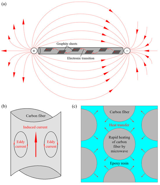 Microwave absorption performance of carbon fiber and epoxy resin: (a) resonance effect of carbon fiber in the electromagnetic field; (b) skin effect of carbon fiber caused by eddy currents; (c) diagram of heat transfer between fibers and resins.