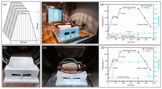 To evaluate the compound process’s ability to reduce its reliance on pressure during the formation of complex curved components, while still meeting established standards for accuracy and quality, an autoclave process with the same temperature curve was employed as the experimental control group, but the curing pressure was consistently maintained at 0.6 MPa, as shown in Figure 3e,f, respectively.