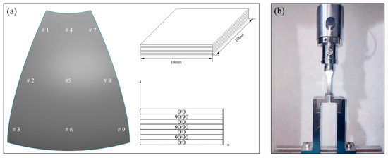 This study employed T800/#602 carbon fiber-reinforced composite materials, with a single-layer thickness of 0.17 mm, a density of 1.6 g/cm3, a fiber volume fraction of 65%, and a resin matrix of thermosetting epoxy, provided by the China Academy of Launch Vehicle Technology (CALT, Beijing, China). Following the ply stacking sequence of the composite tank prototype provided by the CALT, the melon petals were manually laid in a [0/0/90/90/0/0/90]s configuration. Based on the effective surface area calculation, the single prepreg layer was cut into a trapezoidal shape with dimensions of 90 mm on the top, 240 mm on the bottom, and a height of 280 mm, as shown in Figure 3a. The selection of the mold considered the need for the mold to have an absence of electromagnetic interactions and the ability to withstand vibration loads without deformation or damage. Therefore, in this study, a mold made of polytetrafluoroethylene (PTFE) with good microwave penetration was used as an alternative to traditional metal and glass molds, as illustrated in Figure 3b.