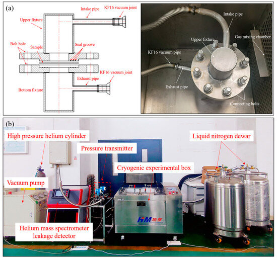 The permeation rate is commonly defined as the volume of gas that consistently passes through a specimen per unit time under constant temperature and pressure-differential conditions, with units expressed in . In accordance with the Chinese standard GB/T 1038-2000 [36], this study involved the independent design and development of cryogenic permeability testing equipment specifically tailored to composite materials. The testing principle involves placing the specimen between two sealing fixtures, forming a sealed chamber with upper and lower sections, and thereby creating a high-pressure chamber and a low-pressure chamber, as shown in Figure 5a. Subsequently, high-pressure gas is introduced into the high-pressure chamber, while a vacuum pump evacuates the air from the low-pressure chamber to achieve a vacuum state. By using a pressure transducer connected to the low-pressure chamber, the incremental pressure within the low-pressure chamber per unit time can be recorded, enabling the calculation of the permeation rate of the specimen.