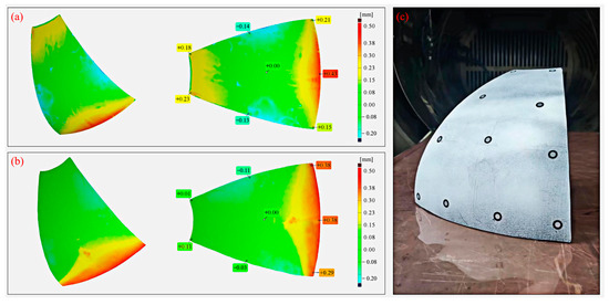 A high-precision three-dimensional scanner, specifically the Infrared/Blue Laser Scanner (model: KSCAN-Magic, SCANTECH Co., Ltd., Hangzhou, China), was employed for the measurement of the surfaces of the melon petals produced via the two distinct processes. This equipment offers a maximum resolution of 0.01 mm and its highest accuracy level is 0.02 mm within the scanned area. The component surfaces underwent multiple scans, ensuring comprehensive coverage and confirming that there were no noticeable deficiencies in the component shapes. Subsequently, the test results were compared with the target model surfaces: using the target model surface as a reference, two endpoints at the larger end of the component and the midpoint at the smaller end were selected as reference points for comparison, and the relative deviations between the formed component surfaces and the target surfaces were finally obtained.