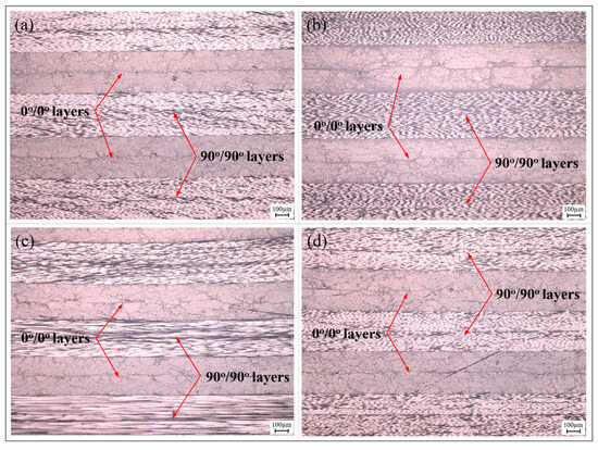 The internal microstructure of partial regions of the melon petals formed using the autoclave process is shown in Figure 7. It is evident that, across various curvatures of the component, the layers are closely combined, with the resin uniformly permeating the interstices between the fiber bundles. No noticeable voids or delamination defects are observed within or between layers, both along the carbon fiber direction and perpendicular to it. Given the curing pressure of 0.6 MPa, the static hydrostatic pressure induced by the resin matrix surpasses the pressure within voids. This action serves to suppress void expansion and coalescence, while potentially prompting voids to undergo collapse in response to high-pressure conditions, allowing them to dissolve back into the resin matrix. Furthermore, the pressure differential along the thickness of the component progressively encourages resin infiltration between fiber bundles as the curing temperature increases, further enhancing the resin’s wettability and bonding properties while eliminating the voids present between fiber bundles.