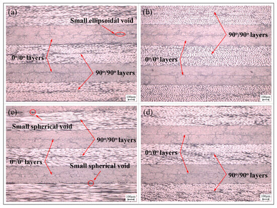 Figure 8 illustrates the internal microstructure of the components produced using the vibration pretreatment and microwave curing compound process. Similar to the components manufactured through the autoclave process, no significant voids or delamination defects are observed in cross-sections parallel and perpendicular to the fibers. Only a small number of small-sized voids exist at the interfaces between layers in specific areas of the component, primarily taking on circular and elliptical shapes. This phenomenon strongly indicates that the reduction and inhibition effects of vibration pretreatment on curing defects in composite materials are not limited to structurally simple laminates, but are equally applicable to components with complex structural features and variable curvatures. Differing from the autoclave process in which resins infiltrate carbon fibers layer by layer and eliminate voids via high pressure, under the excitation of vibration energy, voids exhibit significant dynamic response characteristics; this not only promotes a reduction in their interface area and volume, but also accelerates their contraction due to surface tension. Simultaneously, the input of vibration energy also positively affects the resin’s flowability, contributing to the buoyant movement of voids within the components, as shown in Figure 9. Ultimately, this leads to a reduction in and the suppression of curing defects in the form of void collapse and escape.