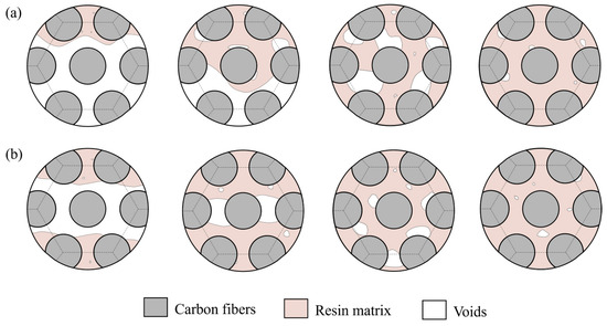 Illustration of resin infiltration and void formation: (a) autoclave process; (b) compound process.