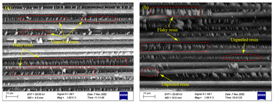 Specimens formed via the compound curing process exhibited similar morphological features on their horizontal cross-sections. The introduction of the vibration energy field enabled the resin to flow freely between, and fill the gaps between, the fiber bundles, preventing the excessive accumulation of resin between them. This facilitated the effective transfer of external loads to the carbon fibers, generating uniformly distributed flaky resin between the fiber bundles under shear forces. Additionally, the preferential heating effect of carbon fibers in the microwave field promoted the complete resin impregnation of the surrounding areas, leading to the even envelopment of carbon fiber surfaces by the resin matrix. The above actions enhanced the adhesive strength between the resin and fibers, fully utilizing the outstanding mechanical properties of carbon fibers. Consequently, following the shear failure of the specimens, a substantial amount of adhered, unpeeled resin residue was observed on the carbon fiber surfaces.