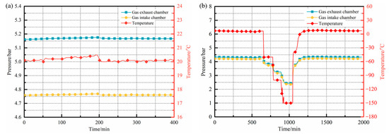 Furthermore, by pre-setting a stepwise cooling curve within the system, the precise temperature control capacity of the equipment and its sealing performance across a range of low-temperature conditions were further validated. The temperature range of the tests covered from room temperature to −150 °C, and the results are shown in Figure 12b. As depicted in the figure, the pressure within both the upper and bottom sealed chambers exhibited synchronous changes in response to variations in the environmental temperature under these low-temperature conditions. Moreover, when the environmental temperature remained constant, the current pressure was maintained, reflecting the excellent sealing performance of the device under different low-temperature environments. Additionally, a comparison of the pressure values within the two sealed chambers before and after the experiments showed that, prior to cooling, the pressure in the upper intake chamber and bottom exhaust chamber was 4.216 bar and 4.334 bar, respectively. Following the conclusion of the test and the return to room temperature, the corresponding pressures within the two sealed chambers were 4.216 bar and 4.330 bar, respectively. Throughout the entire testing procedure, the pressure within the sealed chambers remained constant, providing evidence of an effective seal without noticeable gas permeation within the system.