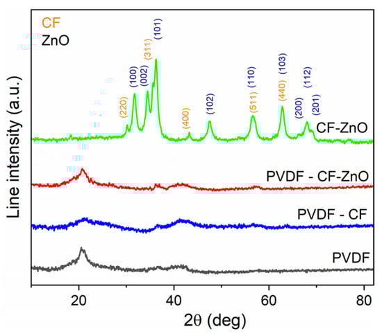 XRD patterns of PVDF, PVDF-CF and PVDF-CF-ZnO membranes.