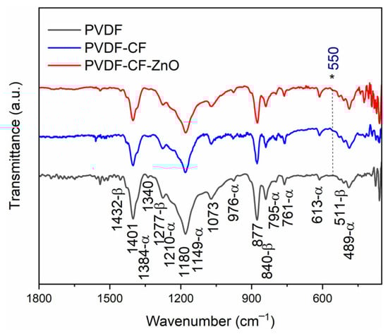 For more details regarding the polymorphic phase formed in the PVDF membrane during the synthesis, ATR-FTIR measurements were performed. The obtained spectra of bare and hybrid membranes are shown in Figure 2.