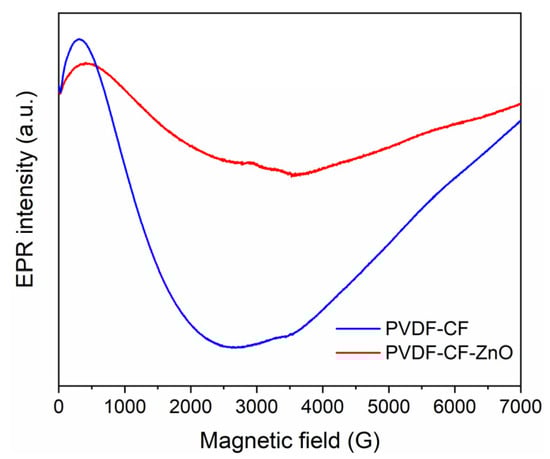 The PVDF-CF membrane shows an intense broad and asymmetric line specific to cobalt ferrite nanoparticles. The line is broad due to the dipolar interaction and to the random orientation of the magnetic nanoparticles having different easy axes and the asymmetry is the result of the random orientation of the magnetic nanoparticles []. Superimposed on this signal at a higher magnetic field is a narrow signal, probably due to the Fe3+ in the octahedral symmetry sites in the spinel structure of Co-ferrite []. The EPR signal of the PVDF-CF-ZnO membrane is similar with that corresponding to the PVDF-CF membrane, but is less intense due to the smaller content of Co-ferrite; additionally, this spectrum shows a signal at g ~ 2 due to the defect states from ZnO []
