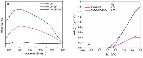 Information about the optical properties of the samples was obtained from UV-Vis spectroscopy. The UV-Vis absorption of the spectra are shown in Figure 6a. The PVDF membrane shows low absorbance in the 300–500 nm range. After modification of the PVDF membrane with Co-ferrite nanoparticles and Co-ferrite-ZnO nanocomposite, a broad and intense absorbance appears due to the charge transfer from the O p and Co d orbitals in strongly hybridized valence band edges into the tetrahedral Fe d states at the bottom of the conduction band [].