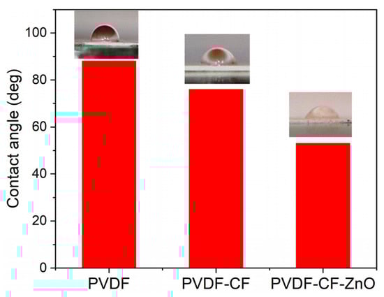 An important factor influencing the antifouling properties of a membrane and, implicitly, the filtering capacity is the hydrophilicity. This characteristic can be evaluated by measuring the contact angle between the water and the membrane surface. A small contact angle assures a hydrophilic character and the good antifouling ability of the membrane. In Figure 7 are presented the obtained contact angles for prepared membranes. The bare membrane has a contact angle of 89° but after blending with CoFe2O4 and CoFe2O4-ZnO, it decreases to 72 and 50°, respectively. An increase in the hydrophilic character of the membrane through nanoparticles blending can be observed. The best hydrophilicity is exhibited by the PVDF-CF-ZnO membrane, probably due to the hydroxyl groups present on the ZnO nanoparticles surface [].