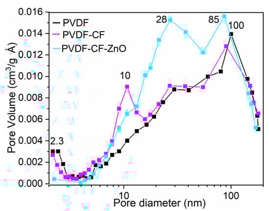 The PVDF membrane shows a multi modal pore distribution curve which demonstrates the presence of non-uniform pores, and a predominance of macro-pores around 100 nm. After embedding the CoFe2O4 and CoFe2O4-ZnO nanoparticles, the pores become deeper, increase in volume, and are more uniform (Figure 8), as can be seen for the PVDF-CF-ZnO sample. Therefore, based on the evaluated pore size diameter, the membranes have the potential to be used as microfiltration membranes [].