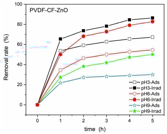 One of the parameters which influence the adsorption and consequently the photocatalytic degradation is the pH of the solution. The pH affects the surface properties of the photocatalyst such as the surface charge and the dissociation of the pollutants []. Therefore, the effect of the initial solution pH on the removal rate of the RhB solution was also determined. For the experiments, an initial solution pH in the range 3–9 was used, the membrane surface was (2 × 2 cm2), and the obtained results are shown in Figure 10. In a basic solution (pH of about 9) the removal rate is low probably due to the repulsion between the membrane and the pollutant molecules, which are both loaded with a negative charge []. This repulsion drives the low adsorption of the pollutant molecules on the catalyst surface, resulting in low photocatalytic activity. The acidic to neutral (pH of 3 and 6) solutions were more effective in degrading than basic solutions. The pH of about 3 provided the highest adsorption capacity and removal rate, but the difference between removal rate and adsorption capacity is lower than in the case of pH 6, meaning that neutral condition is favorable for photocatalytic properties and, therefore, self-cleaning activity.