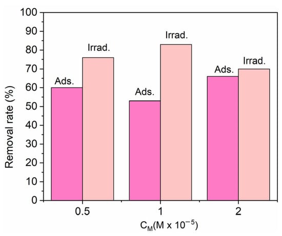 Another parameter that influences the photocatalytic process is the dye dosage. To verify the impact of RhB concentrations on the removal rate of the PVDF-CF-ZnO sample, three dye concentrations of 0.5, 1, and 2 × 10−5 M were used. The removal rates obtained after 5 h dark adsorption and visible irradiation in the cases of the mentioned concentrations are shown in Figure 10. In accordance with Figure 11, 1 × 10−5 M concentration of RhB is beneficial for photocatalytic activity; this dosage stimulates the free radicals and carriers transfer across the photocatalyst surface. A higher dosage drives an excessive RhB adsorption, blocking the light transmission and consequently hindering the photocatalytic process [].
