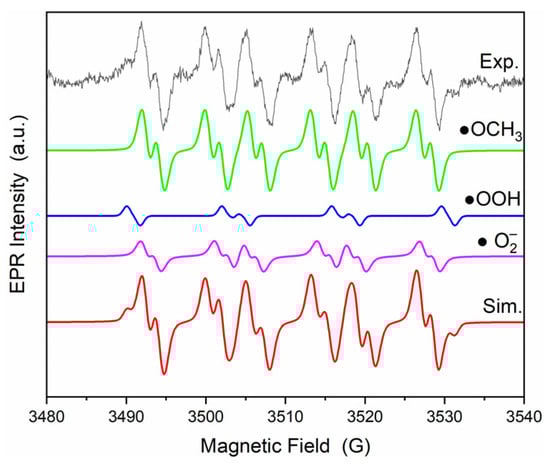 To give more insights into the photocatalytic mechanism, reactive oxygen species (ROS) generated by the hybrid membranes under visible irradiation were identified using EPR spectroscopy coupled with the spin-trapping method. ROS are able to decompose organic molecules []. The experimental spectra of the obtained spin-adducts generated by the hybrid membranes are similar. As an example, the spectrum of the obtained spin adducts generated using the PVDF-CF-ZnO membrane under 25 min visible irradiation is shown in Figure 12. The spectrum is a complex one containing many resonance lines specific to the spin adducts generated under visible irradiation. The simulation of the spectrum was performed to identify the spin adducts which contribute to the spectrum.