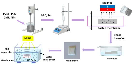 Schematic illustration of membranes preparation and photocatalytic testing setup.
