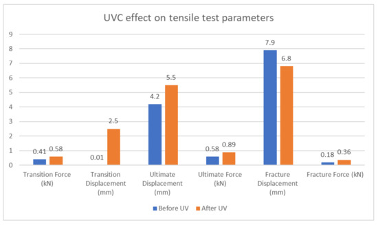Table 15 and Figure 16 provide a clear representation of the effects of UVC treatment on the material’s yield stress, ultimate stress, and fracture stress. Here are the findings: