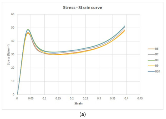 As detailed in Table 13, the computed average value of resilience for the five compression test specimens stands at 0.71 J/m3. Additionally, the average toughness of the material is calculated to be 15 J/m3.
