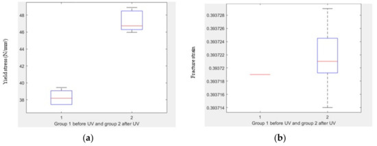 - Yield stress: There is a significant difference in yield stress before and after UV treatment, with a p-value of 1.29 × 10−6 (Figure 15a).