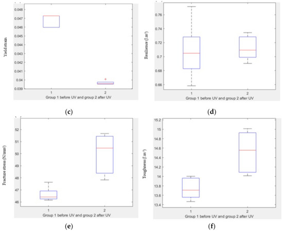 Figure 15. Comparison between treated and untreated samples. (a) Boxplot of yield stress before and after UV, (b) boxplot of yield strain before and after UV, (c) boxplot of fracture stress before and after UV, (d) boxplot of fracture strain before and after UV, (e) boxplot of resilience before and after UV, and (f) boxplot of toughness before and after UV. - Yield strain: There is a significant difference in yield strain before and after UV treatment, with a p-value of 2.78 × 10−8 (Figure 15b).