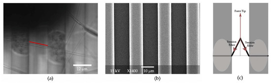 The cantilever tip was positioned next to the fiber in the center of the well. The movement of the cantilever was controlled using a homemade script named Controlled Step, which allowed the cantilever to be maneuvered in steps of selected size and stepping rate. The strain rate for fiber manipulation was held constant at 200 nm/s. The fibers glued at the ridges were pulled laterally until they ruptured. A schematic of the lateral force manipulations can be found in the work by Baker et al. [50].