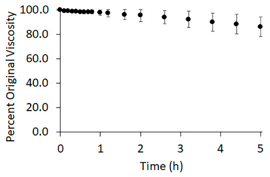 Average percent viscosity of 10 g/dL PCL in 3:1 acetic acid: formic acid. The data is an average over three trials with error bars representing the standard deviation. The zero-time point indicates the moment the solution completed its 3 h of mixing. The data was recorded for five hours.
