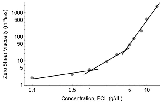 To further support our calculations, we analyzed the zero-shear viscosity data versus the polymer concentration (Figure 3). From these data, the dilute, semi-dilute unentangled, and semi-dilute entangled regimes were identified. The intersection of linear fits for the dilute/semi-dilute unentangled and semi-dilute unentangled/semi-dilute entangled regimes provided values for c*, the critical concentration overlap, and ce, the entanglement concentration, respectively. The critical concentration overlap was approximately 1 g/dL PCL while the entanglement concentration was 4.5 g/dL PCL, in good agreement with the calculated onset of entanglement at 4 g/dL.