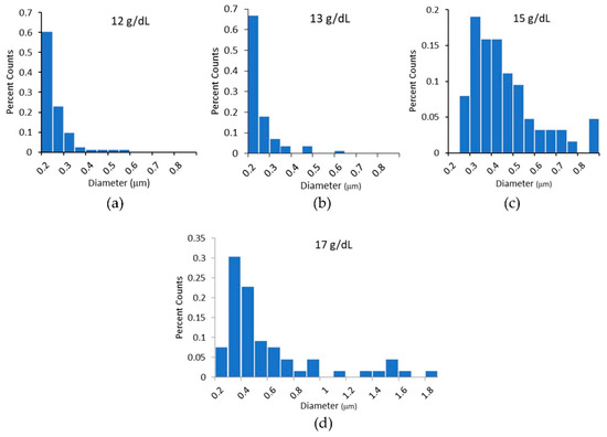 Many have reported a similar diameter dependence on concentration [52,53,54]. At lower viscosities, electrospun fibers formed under constant spinning parameters, such as collector distance and voltage, form smaller diameter fibers. The higher-viscosity polymer solutions offer greater resistance to the flow stresses and whipping stresses during electrospinning and form larger fibers.