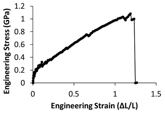 Electrospun nanofibers hold the potential for applications in many fields, including textiles, filtration, photonics, electronics, medicine, material engineering, and tissue engineering [1,2,3,4,5,6]. However, many of these applications require specific fiber mechanical properties. For example, when using electrospun fibers in tissue engineering of cell scaffolds, the mechanical properties of the fibrous scaffold affect cell survival, proliferation, and migration and, therefore, must be tailored to match the application [7,8,9]. Additionally, the mechanical properties of electrospun fibers are important in their applications as reinforcements in composite materials [10,11]. More generally, electrospun fibers must be able to withstand the forces and pressures exerted by their environment during their lifespan as a textile, filter, scaffold, etc. Therefore, measuring, controlling, and understanding the mechanisms related to the mechanical properties of electrospun fibers and mats is important in realizing their potential.