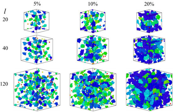 Figure 1 illustrates snapshots of clusters formed in melts of chains with varying lengths and sticky fractions. We define a cluster as a collection of sticky beads such that each sticky bead has at least one sticky bead neighbor within a distance of 1.5. The clusters in Figure 1 are colored based on their size (i.e., the number of sticky beads present within the cluster) using a red–green–blue color scheme, with single sticky beads in red and medium-sized and larger clusters in green and blue, respectively. Even at 5% significant clustering effects are observed (Figure 1 (left)). Such results are similar to Kirkmeyer et al. [19] who observed ionic aggregates in ionomers using STEM imaging. Figure 1 also shows that the average cluster size increases with increase in , while the effect of chain-length on overall cluster sizes appears weak. The formation of a typical cluster about average size in a polymer melt corresponding to 120 and 5%. is shown in Supplementary Section (Video S2).