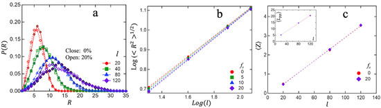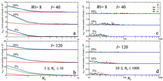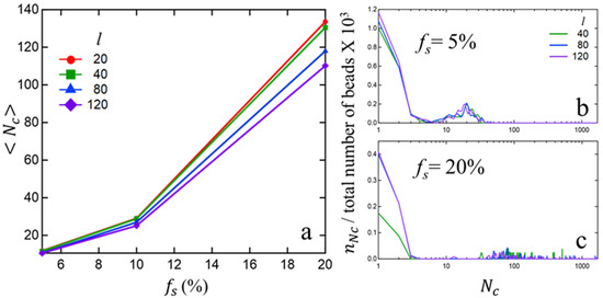 It is interesting to note that, at a low sticky fraction (), the average cluster size (and the cluster size distribution on whole) is insensitive to the polymer chain-length . However, at higher sticky fractions, the average cluster-size decreases monotonically with chain-length, with a sharper decrease around and above the entanglement length. Figure 2c provides deeper insight into this phenomenon by showing that the number of ‘isolated sticky beads’ () is significantly higher for as compared to . One can attribute such behavior to entanglement-induced constraints to structural relaxation of larger chains as compared to shorter chains, which hinders the aggregation process of sticky beads into larger clusters. Additionally, when comparing Figure 2b,c, one observes a much wider distribution of cluster sizes at a larger sticky fraction (for chains of all sizes), a clear indication of a combinatorically much larger number of choices of cluster formation in the presence of a larger number of associating groups.