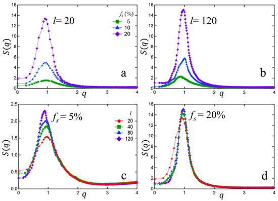 Structure factor of sticky beads as a function of momentum transfer wave vector q for different chain-lengths l = 20 (a) and 120 (b) and sticky fractions = 5% (c) and 20% (d). We focus on the small- region ( in units of ), which displays a single peak representative of inter-cluster ordering.