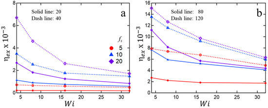 The processing of ionomer melts under different flow conditions is of great technological interest. Several studies in the associating polymer literature have shown significant correlation between the strength of association and rheological properties, including the ease or difficulty of processability [62,63,64,65,66]. To this end, we simulated flow under a constant Hencky strain rate (or equivalently, constant Weissenberg number (), see Section 2) for melts of different chain-lengths and sticky fractions. Figure 6 plots the terminal extensional viscosity ( for large , where is extensional stress as defined in Section 2) as a function of . In all cases, we observe shear thinning behavior and an enhancement of viscosity with increasing chain-length and sticky fraction. To provide further insight, we have analyzed the extensional stress response and average cluster size in Figure 7 and Figure 8.
