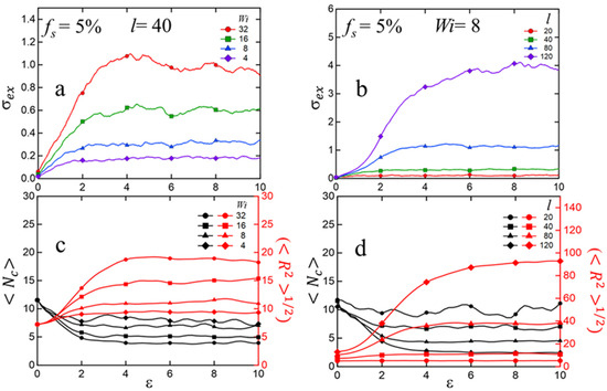 Figure 8 explores extensional stress and average cluster size at a fixed flow rate () for various sticky fractions and two different chain-lengths. We observe that both extensional stress and average cluster-size in steady-state flow increase with increasing sticky fraction . Additionally, we also see that at higher sticky fractions (10% and higher) a stress overshoot develops that is not observable at low . Such behavior in strongly associating polymers has been documented in previous experimental [22,67,68] and simulation studies, both all-atom [36] and coarse-grained [30].