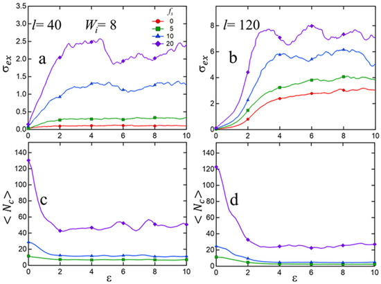 Extensional stress () and average cluster size () as a function of Hencky strain () for different sticky fractions at a fixed strain-rate () for two different chain-lengths (): (a) for ; (b) for ; (c) for ; (d) for .