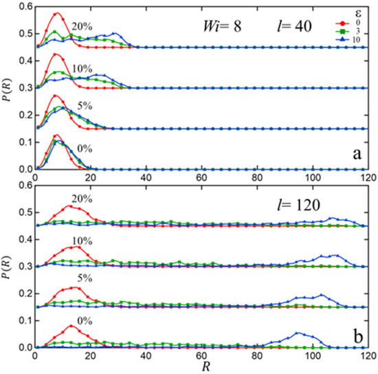 (a) Distribution function of the intra-chain end-to-end distance for a fixed strain rate () and different sticky fractions () at three different values of Hencky strain () and two different chain-lengths: (a) ; (b) . For clarity, curves for 5, 10, and 20% are vertically shifted by 0.15, 0.30, and 0.45, respectively.