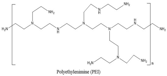 When the pH is low, the compound known as poly(ethylenimine) (PEI) is soluble in hot water, ethanol, and chloroform. The compound is impervious to the solubility of cold water, acetone, benzene, and ethyl ether. Branched PEI (BPEI) is a polymer with repeating units composed of ethylene diamine groups. Aziridine ring-opening polymerization led to the formation of BPEI. BPEI is a cationic polymer that contains primary, secondary, and tertiary amino groups (Figure 2). Such types of water-soluble polymers having a high density of amines are one of the most promising cationic vectors for gene delivery. Hence, constructing nanocarriers that contain PEI has attracted considerable research efforts in gene therapy because of the synergetic effects of PEI molecules (for their efficient transfection) and the multi-functionality of nanoparticles in delivery. BPEI can be prepared with a divergent synthesis method from an ethylenediamine core. Day by day, highly branched polymers have also attracted growing interest in various fields, especially in drug delivery, gene delivery, and diagnosis [43,44]. Major applications of BPEI include the stable combination with other positively charged particles, layer-by-layer construction of nanoparticle surfaces, binding to negatively charged substrates or larger particles, and colour engineering.